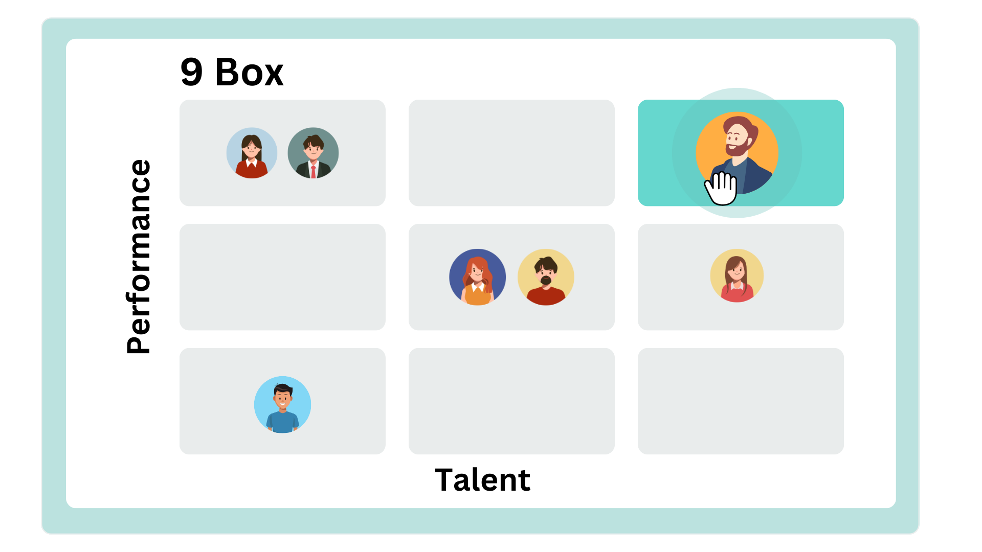 Map every employee on a clear 9-grid matrix, using talent on one axis and performance on the other. Patterns stand out fast—so you can spot rising stars, future talents, rough diamonds, and real dilemmas.