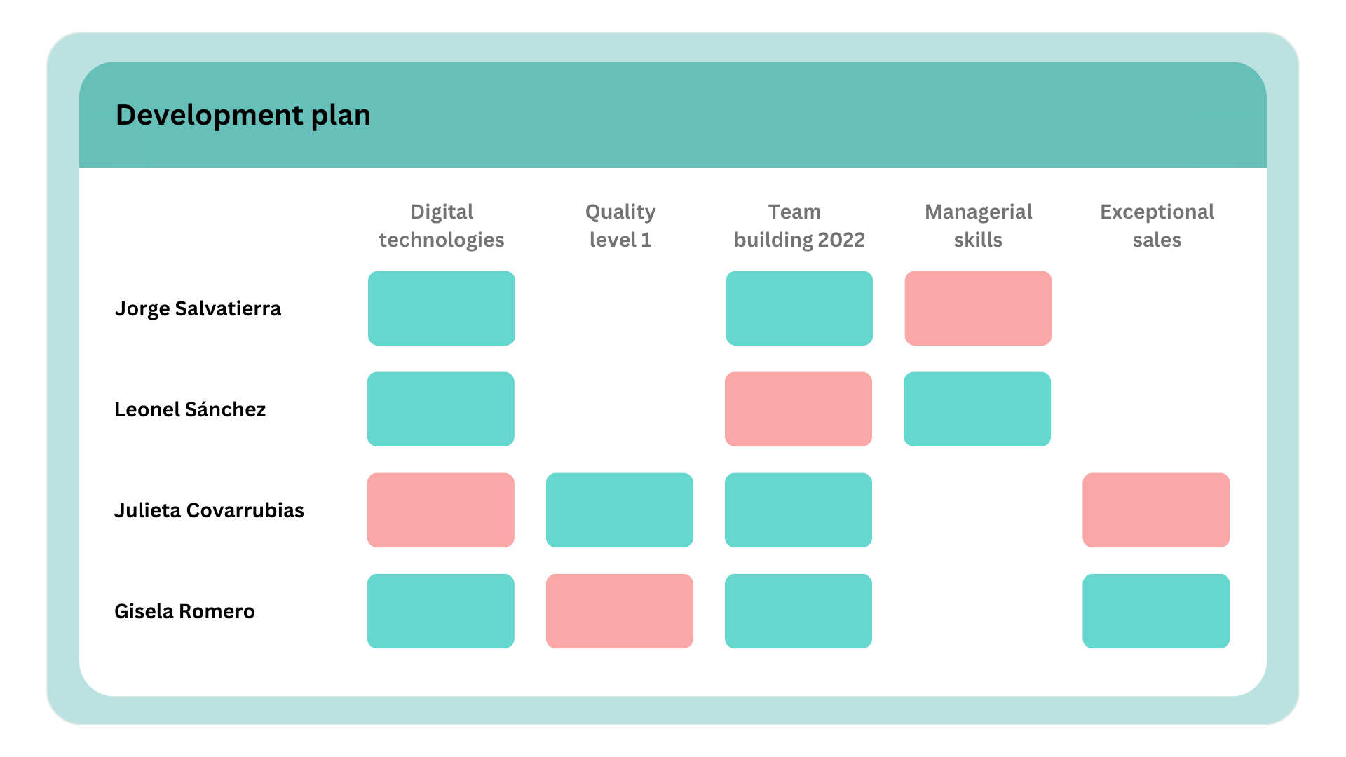 Know the level of workload of each person according to their job profile. Identifies the levels of compliance of each person and verifies that compliance with the development plan.